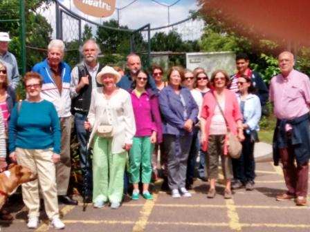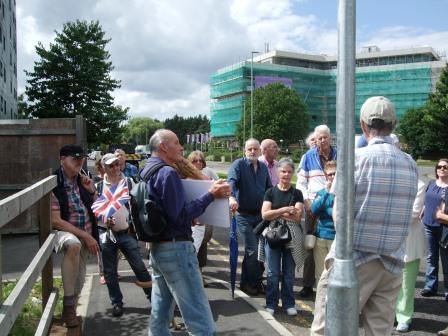 Dave Armitage and John Woolston from the Museum lead the intrepid walkers round the east side of Boreham Wood on this years History Walk – the 10th would you believe. Starting from the Ark, and taking unfamiliar paths and passages, we travelled via Well End, over a suspected Roman road, down and around the MGM studio site to Elstree Way and the large number of industries that have come and gone along this area. At every significant point we could examine old photos of the area which brought the history alive. Dave pointed out that this end of the town was originally three farms and all the roads that linked them were just paths and tracks. We ended up in Maxwell Park and the Community Centre, via the original drover’s road from the farms to The Village. An excellent walk, and no one complained of aching feet!