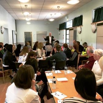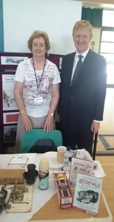 Hertsmere MP, Oliver Dowden, visited the Museum stall at the Hertsmere Keeping Well drop-in Session at Allum Hall on Friday. Providing advice, information and activities to help older people keep well, the Session involved many local organisations such as Careline, Crossroads, Age UK and Community Action Hertsmere, etc, to give carers and others ideas. The Museum had a number of objects on display from the ‘50s and earlier which provoked memories and discussion from visitors, such as the flask and oil bike lamp seen in our photo. Long-time local resident and Museum volunteer, Betty Chandler, greeted our MP on his way round the Hall. Later, Museum members attended a Dementia Friends session for more detailed information in recognition of Dementia Awareness Week.