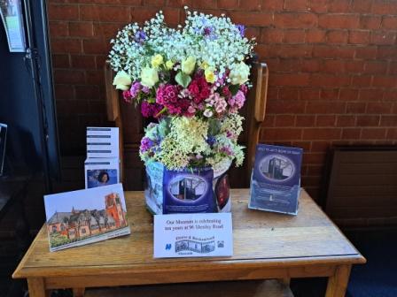 This is our contribution to the Civic Festival with the display of flowers in All Saints Church. Celebrating 10 years at 96 Shenley Road, the beautiful arrangement was created by volunteer Maureen Corman. Open daily 11am to 1pm until Monday 19th. We do hope you can visit the Festival.