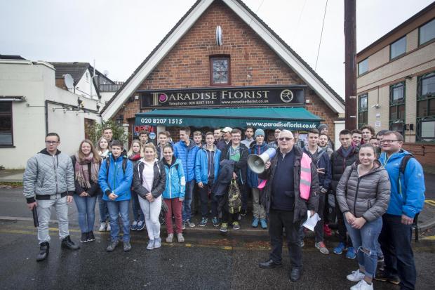Museum Manager, Dave Armitage, and volunteer Lynda Marshall were recently accompanying 70 teenagers from Offenburg which is Borehamwood’s twin town in Germany. They spent a while touring the town with Lynda as translator and guide, and then Dave gave a 45 minute talk about the changing face of Borehamwood over the past 150 years. Our photo shows some of the teenagers and Nick Male from BETTA (Borehamwood and Elstree Twin Town Association).