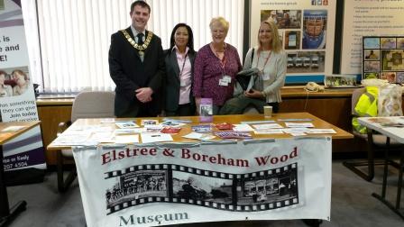 The Museum provided a table at the CAH (Community Action Hertsmere) AGM this week as our picture shows. The CAH is an umbrella charitable organisation which supports many small clubs and charities in the area. In the photo (l. to r.) are Cllr. Richard Butler (current Town Mayor), Cllr.Cynthia Barker, Elaine Butchins - a Trustee of the Museum, and a visitor to the stand.