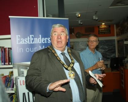 The first photo shows part of the new Exhibition, the second shows Dominic Treadwell-Collins, the Executive Producer of EastEnders opening the Exhibition flanked by Museum Manager Dave Armitage and Ruth Stratton, Hertsmere Heritage and Museums Officer, while the third shows Hertsmere Mayor Councillor Martin Worcester. Photos by Clive Butchins